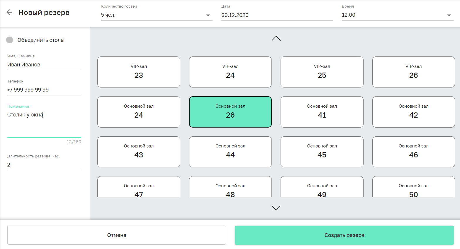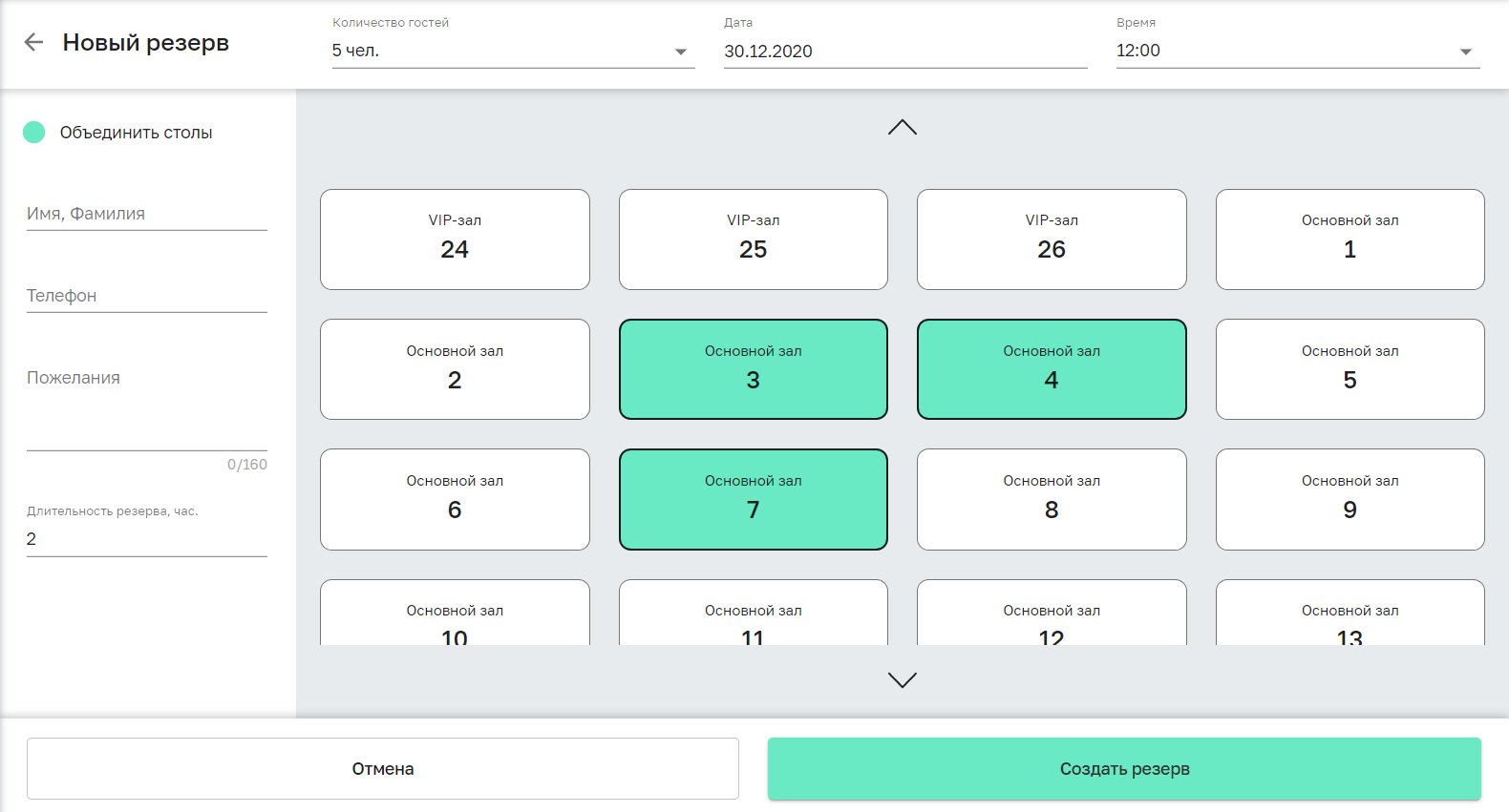 Если подходящих под запрос гостя столов нет, выберите опцию Объединить столы. После этого вы сможете выбрать несколько столов и резерв будет заведен на них. Все столы в резерве должны находиться в одном зале.