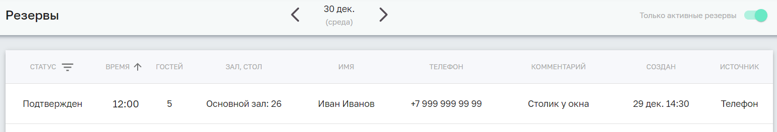 После заполнения всех полей нажмите кнопку «Создать резерв». Резерв отобразится в таблице и будет сразу же синхронизирован с Главной кассой iiko, появится в iikoFront.
